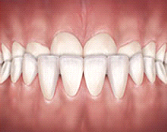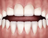 An overbite or deep bite is characterized by upper front teeth extending out over the lower front teeth, causing the lower front teeth to bite into the roof of the mouth and is completely hidden behind the upper teeth.